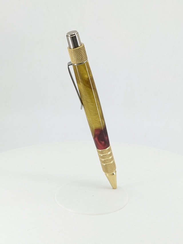 自作のウレタンレジンを使用したボールペンが登場です! 10金メッキ仕上げで手軽に金の輝きを楽しむことができます。 全長:約123mm 重量:約35g 材質:ウレタンレジン 銅合金 10金メッキ 替え芯タイプ:ISO 12757-2(JIS S 0639) G2 ・お手入れについて 比較的耐久性の高い材質ですが、使用後は軽く拭いて清潔に保つことをおすすめします。特に、外部の水分や汚れに注意し、大切に取り扱うことで、長くご愛用いただけます。
